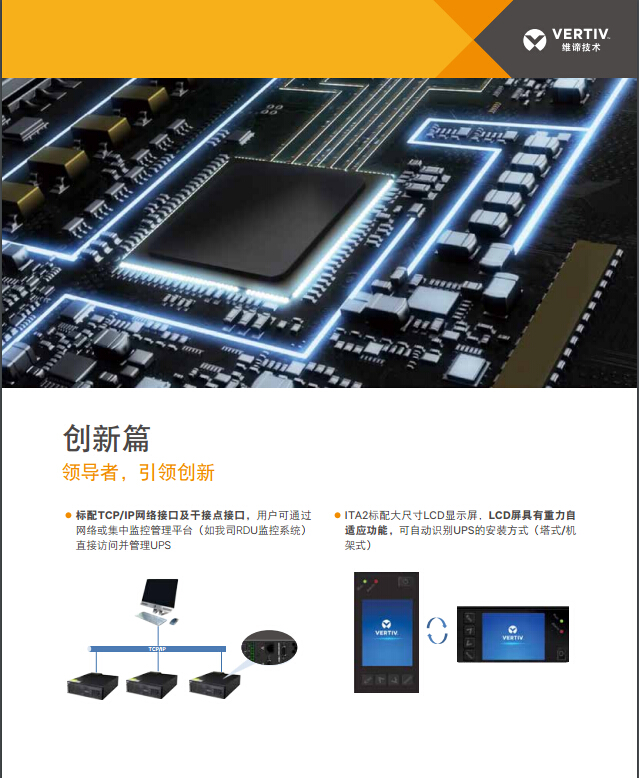 Vertiv Liebert ITA2 系列UPS是維諦技術(Vertiv)憑借數十年的UPS設計和制造經驗,針對互聯網時代下市場提出的新需求而重磅推出的新一代小功率機架式UPS產品。ITA2系列UPS目前發布的容量為5-20KVA,它具有“可靠、極致、創新、靈活”四大客戶價值,是客戶不間斷供電的首選產品,更是業界的新標桿。